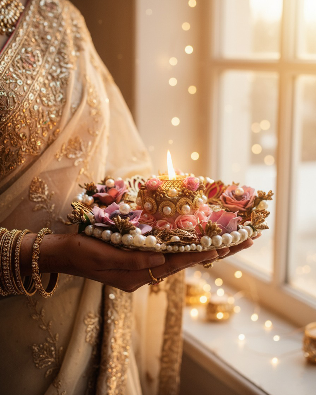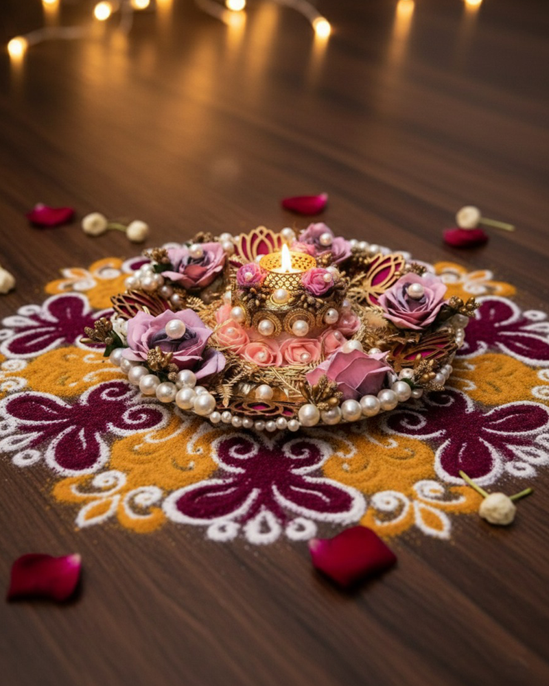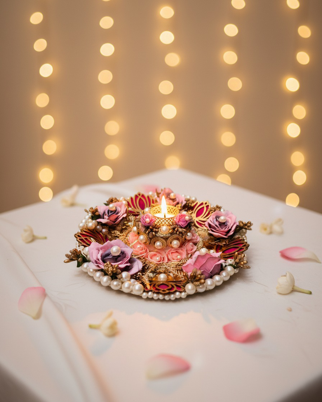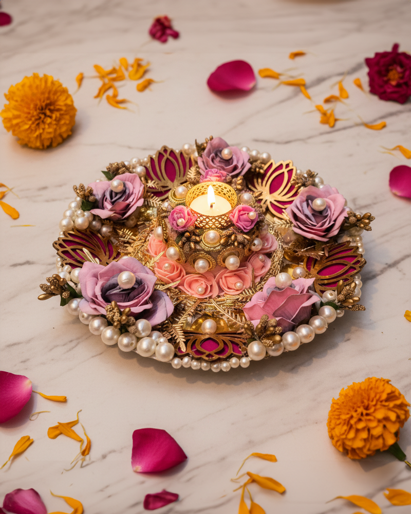 Mauve & Pink Rose Artificial Flower Pearl Tealight Holder